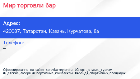 Мир торговли, бар по адресу 420087, Татарстан, Казань, Курчатова, 8а в дальнейшем Организация, размещена в следующих категориях: