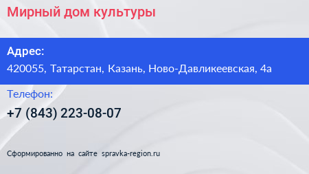 Мирный, дом культуры по адресу 420055, Татарстан, Казань, Ново-Давликеевская, 4а в дальнейшем Организация, размещена в следующих категориях: