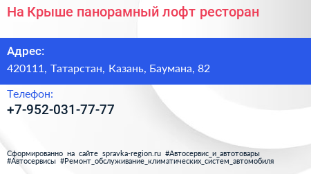 На Крыше, панорамный лофт-ресторан по адресу 420111, Татарстан, Казань, Баумана, 82 в дальнейшем Организация, размещена в следующих категориях: