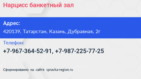 Нарцисс, банкетный зал по адресу 420139, Татарстан, Казань, Дубравная, 2г в дальнейшем Организация, размещена в следующих категориях: