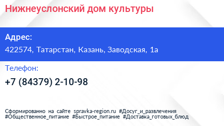 Нижнеуслонский, дом культуры по адресу 422574, Татарстан, Казань, Заводская, 1а в дальнейшем Организация, размещена в следующих категориях: