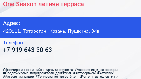 One Season, летняя терраса по адресу 420111, Татарстан, Казань, Пушкина, 34в в дальнейшем Организация, размещена в следующих категориях: