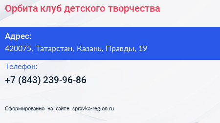 Орбита, клуб детского творчества по адресу 420075, Татарстан, Казань, Правды, 19 в дальнейшем Организация, размещена в следующих категориях: