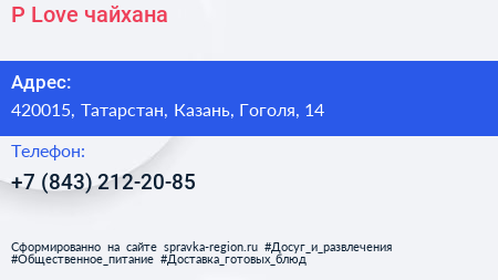 P.Love, чайхана по адресу 420015, Татарстан, Казань, Гоголя, 14 в дальнейшем Организация, размещена в следующих категориях: