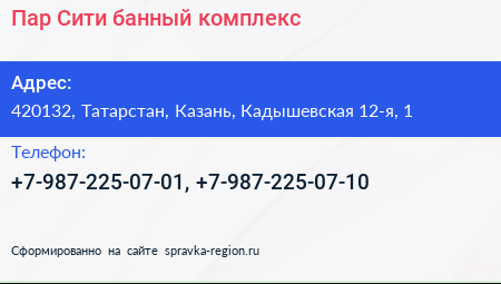 Пар Сити, банный комплекс по адресу 420132, Татарстан, Казань, Кадышевская 12-я, 1 в дальнейшем Организация, размещена в следующих категориях: