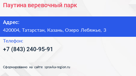 Паутина, веревочный парк по адресу 420004, Татарстан, Казань, Озеро Лебяжье, 3 в дальнейшем Организация, размещена в следующих категориях: