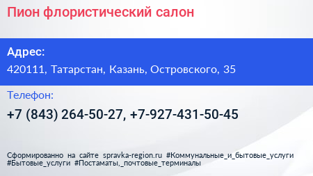 Пион, флористический салон по адресу 420111, Татарстан, Казань, Островского, 35 в дальнейшем Организация, размещена в следующих категориях: