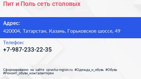Пит и Поль, сеть столовых по адресу 420004, Татарстан, Казань, Горьковское шоссе, 49 в дальнейшем Организация, размещена в следующих категориях: