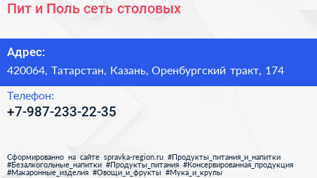 Пит и Поль, сеть столовых по адресу 420064, Татарстан, Казань, Оренбургский тракт, 174 в дальнейшем Организация, размещена в следующих категориях: