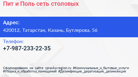 Пит и Поль, сеть столовых по адресу 420012, Татарстан, Казань, Бутлерова, 56 в дальнейшем Организация, размещена в следующих категориях: