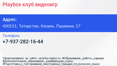 Playbox, клуб видеоигр по адресу 420111, Татарстан, Казань, Пушкина, 17 в дальнейшем Организация, размещена в следующих категориях: