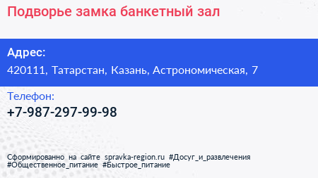 Подворье замка, банкетный зал по адресу 420111, Татарстан, Казань, Астрономическая, 7 в дальнейшем Организация, размещена в следующих категориях: