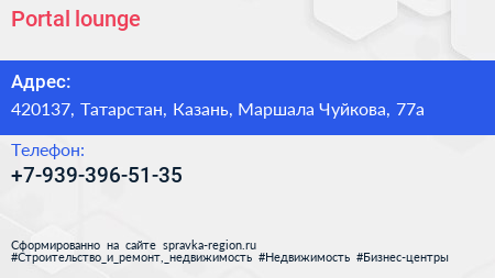 Portal lounge по адресу 420137, Татарстан, Казань, Маршала Чуйкова, 77а в дальнейшем Организация, размещена в следующих категориях: