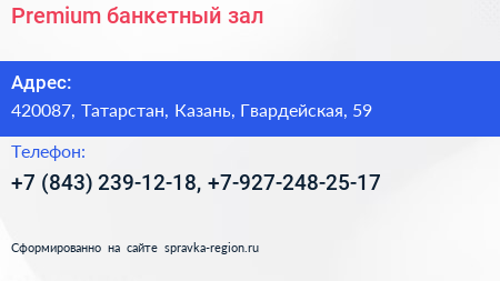 Premium, банкетный зал по адресу 420087, Татарстан, Казань, Гвардейская, 59 в дальнейшем Организация, размещена в следующих категориях: