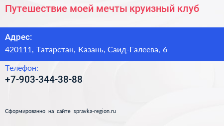 Путешествие моей мечты, круизный клуб по адресу 420111, Татарстан, Казань, Саид-Галеева, 6 в дальнейшем Организация, размещена в следующих категориях: