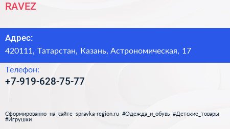 RAVEZ по адресу 420111, Татарстан, Казань, Астрономическая, 17 в дальнейшем Организация, размещена в следующих категориях:
