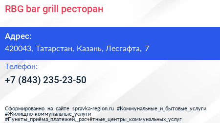 RBG bar & grill, ресторан по адресу 420043, Татарстан, Казань, Лесгафта, 7 в дальнейшем Организация, размещена в следующих категориях: