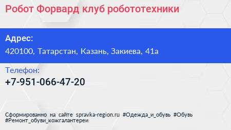 Робот Форвард, клуб робототехники по адресу 420100, Татарстан, Казань, Закиева, 41а в дальнейшем Организация, размещена в следующих категориях: