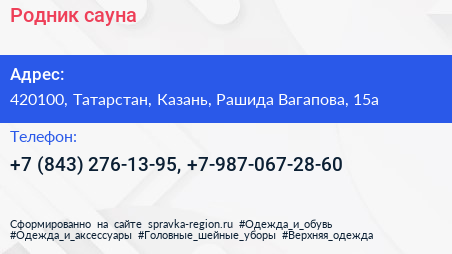 Родник, сауна по адресу 420100, Татарстан, Казань, Рашида Вагапова, 15а в дальнейшем Организация, размещена в следующих категориях: