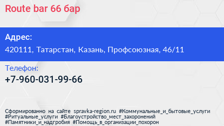 Route bar 66, бар по адресу 420111, Татарстан, Казань, Профсоюзная, 46/11 в дальнейшем Организация, размещена в следующих категориях: