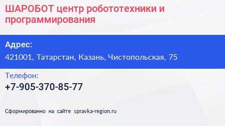 ШАРОБОТ, центр робототехники и программирования по адресу 421001, Татарстан, Казань, Чистопольская, 75 в дальнейшем Организация, размещена в следующих категориях: