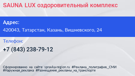 SAUNA-LUX, оздоровительный комплекс по адресу 420043, Татарстан, Казань, Вишневского, 24 в дальнейшем Организация, размещена в следующих категориях: