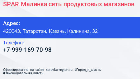 SPAR & Малинка, сеть продуктовых магазинов по адресу 420043, Татарстан, Казань, Калинина, 32 в дальнейшем Организация, размещена в следующих категориях: