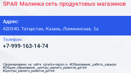 SPAR & Малинка, сеть продуктовых магазинов по адресу 420140, Татарстан, Казань, Ломжинская, 1а в дальнейшем Организация, размещена в следующих категориях: