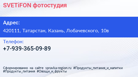 SVETiFON, фотостудия по адресу 420111, Татарстан, Казань, Лобачевского, 10в в дальнейшем Организация, размещена в следующих категориях: