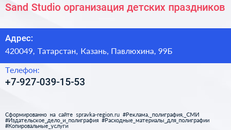 Sand Studio, организация детских праздников по адресу 420049, Татарстан, Казань, Павлюхина, 99Б в дальнейшем Организация, размещена в следующих категориях: