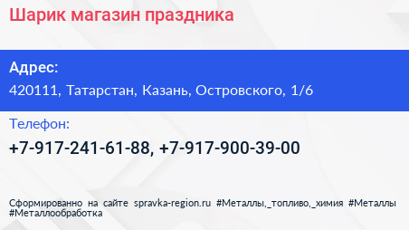 Шарик, магазин праздника по адресу 420111, Татарстан, Казань, Островского, 1/6 в дальнейшем Организация, размещена в следующих категориях: