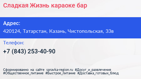 Сладкая Жизнь, караоке-бар по адресу 420124, Татарстан, Казань, Чистопольская, 33в в дальнейшем Организация, размещена в следующих категориях: