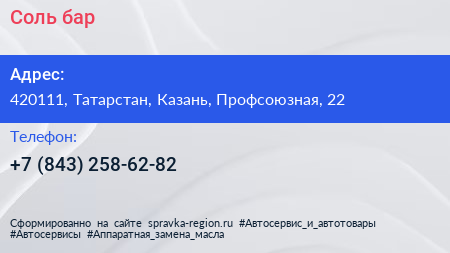 Соль, бар по адресу 420111, Татарстан, Казань, Профсоюзная, 22 в дальнейшем Организация, размещена в следующих категориях: