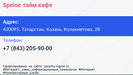 Speloe, тайм-кафе по адресу 420095, Татарстан, Казань, Кулахметова, 28 в дальнейшем Организация, размещена в следующих категориях: