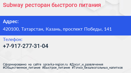 Subway, ресторан быстрого питания по адресу 420100, Татарстан, Казань, проспект Победы, 141 в дальнейшем Организация, размещена в следующих категориях:
