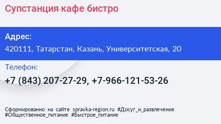 Супстанция, кафе-бистро по адресу 420111, Татарстан, Казань, Университетская, 20 в дальнейшем Организация, размещена в следующих категориях: