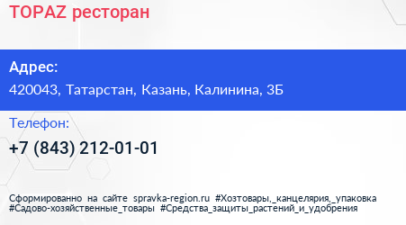 TOPAZ, ресторан по адресу 420043, Татарстан, Казань, Калинина, 3Б в дальнейшем Организация, размещена в следующих категориях: