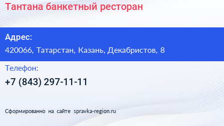 Тантана, банкетный ресторан по адресу 420066, Татарстан, Казань, Декабристов, 8 в дальнейшем Организация, размещена в следующих категориях: