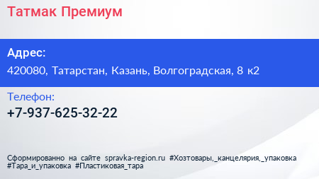 Татмак Премиум по адресу 420080, Татарстан, Казань, Волгоградская, 8 к2 в дальнейшем Организация, размещена в следующих категориях: