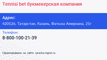 Tennisi.bet, букмекерская компания по адресу 420126, Татарстан, Казань, Фатыха Амирхана, 21г в дальнейшем Организация, размещена в следующих категориях: