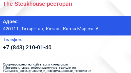 The Steakhouse, ресторан по адресу 420111, Татарстан, Казань, Карла Маркса, 6 в дальнейшем Организация, размещена в следующих категориях:
