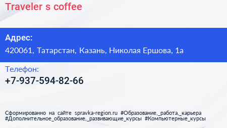 Traveler`s coffee по адресу 420061, Татарстан, Казань, Николая Ершова, 1а в дальнейшем Организация, размещена в следующих категориях: