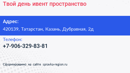 Твой день, ивент-пространство по адресу 420139, Татарстан, Казань, Дубравная, 2д в дальнейшем Организация, размещена в следующих категориях: