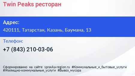 Twin Peaks, ресторан по адресу 420111, Татарстан, Казань, Баумана, 13 в дальнейшем Организация, размещена в следующих категориях: