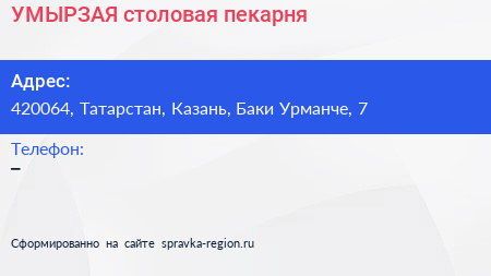 УМЫРЗАЯ, столовая-пекарня по адресу 420064, Татарстан, Казань, Баки Урманче, 7 в дальнейшем Организация, размещена в следующих категориях: