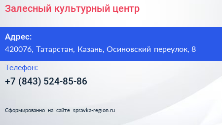 Залесный, культурный центр по адресу 420076, Татарстан, Казань, Осиновский переулок, 8 в дальнейшем Организация, размещена в следующих категориях: