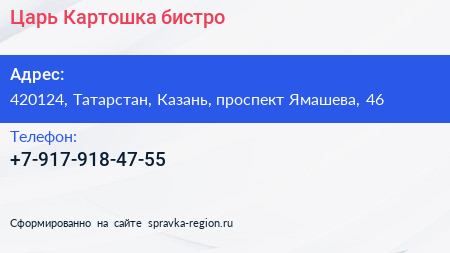 Царь Картошка, бистро по адресу 420124, Татарстан, Казань, проспект Ямашева, 46 в дальнейшем Организация, размещена в следующих категориях:
