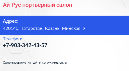 Ай Рус, портьерный салон по адресу 420140, Татарстан, Казань, Минская, 9 в дальнейшем Организация, размещена в следующих категориях: