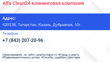 Alfa-Clean24, клининговая компания по адресу 420138, Татарстан, Казань, Дубравная, 51г в дальнейшем Организация, размещена в следующих категориях: