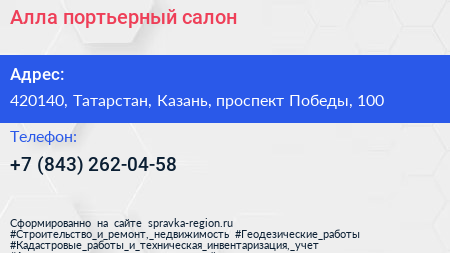 Алла, портьерный салон по адресу 420140, Татарстан, Казань, проспект Победы, 100 в дальнейшем Организация, размещена в следующих категориях: